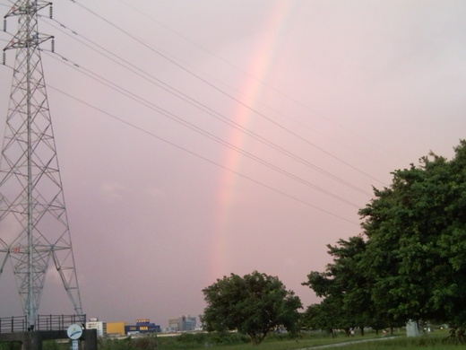 可惜的是這天約的時間比較晚,到了城林橋已經將近五點,天色漸漸變暗。由於路子視力不好,尤其散光嚴重,夜騎的話,很容易因炫光而無法視物,所以我們就先行折返。回程的途中遠方天空出現一條美麗的彩虹,只聽到小朋友興奮地喊著跳者,我也趕緊拿出新買的手機拍了幾張照片,剩下的路線,就等下回再來囉。