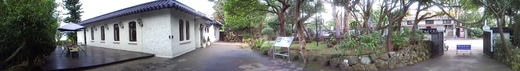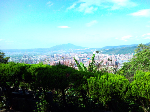 故居的餐廳可以遠眺台北市,風景真的很棒。我們用完餐閒聊了一陣,臨走前就是拍照啦。路子之前換了新手機,剛好趁這機會拿出來測試,新手機有全景拍照功能,使用起來還真的很簡單,只要抓好角度移動手機,機器會自動拍然後合併。