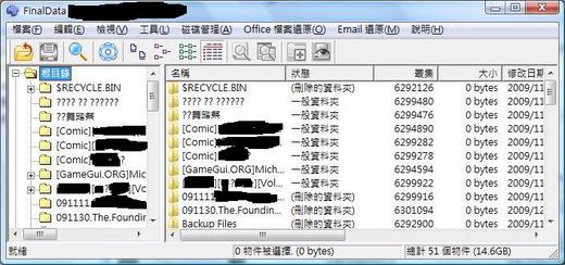 2. 復原: 找一顆硬碟讓軟體把復原的資料COPY過去,基本上這邊就考驗自己的記憶力和軟體的能力了,怎麼說呢? 以我這次所使用的FINALDATA雖然可以分辨繁體中文,可是卻無法閱讀簡體中文,所以我掃描出來的目錄就會出現很多??,問號表示無法辨讀的字元(參考圖片,目錄中的問號都是必需要手動修復的),所以找尋復原軟體的時候,記得中文辨識能力一定是首要考慮,不然你就要一筆一筆修改了。