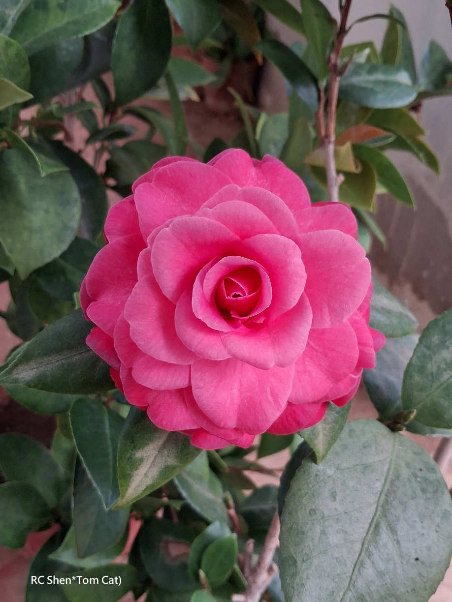 茶花"夢娜玫瑰"今年首開,兩朵今晨同時綻放,艷麗奪目!