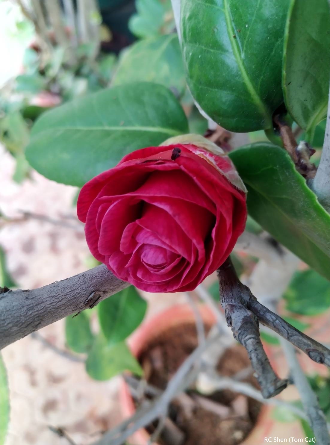 2023-24茶花季:第一朵茶花紅貝拉開出,像玫瑰?