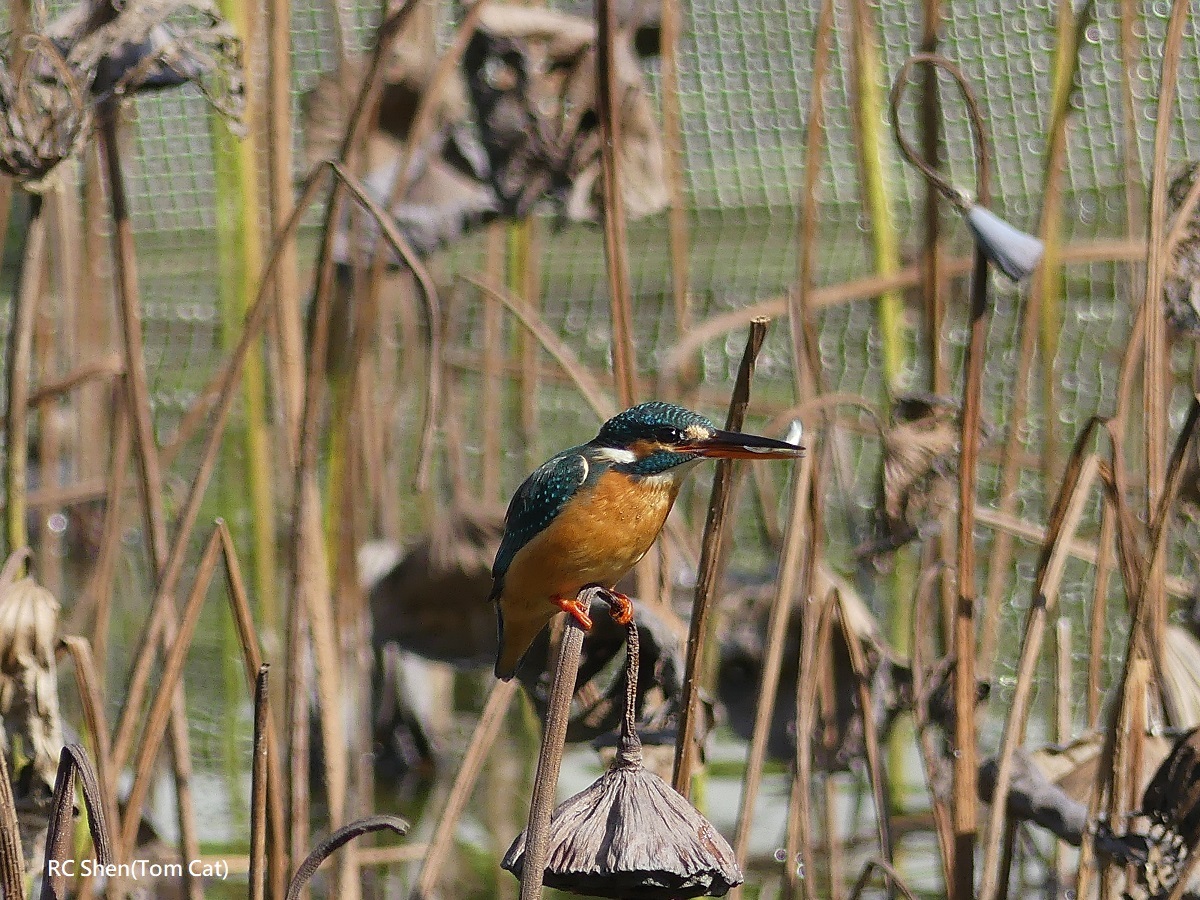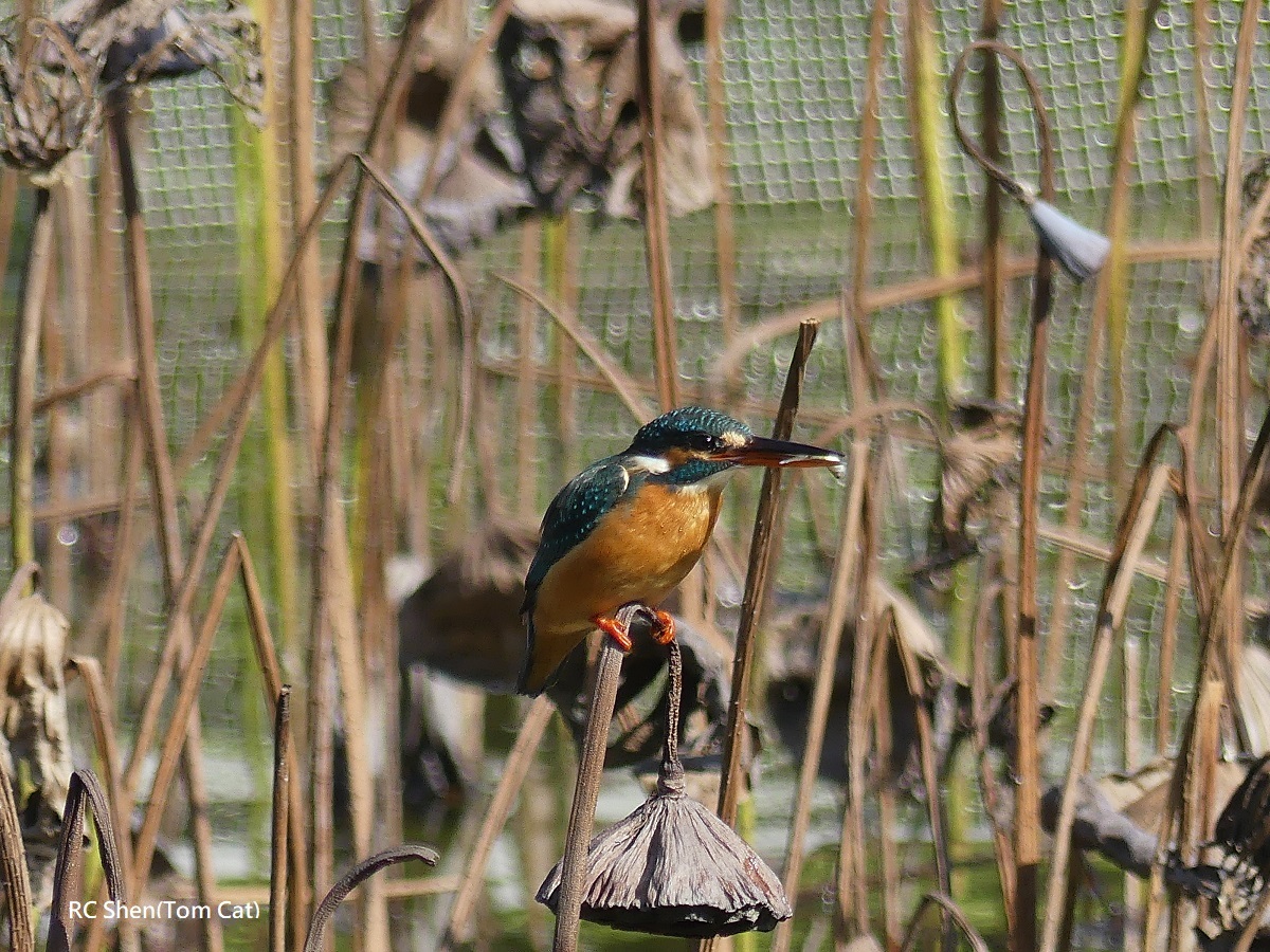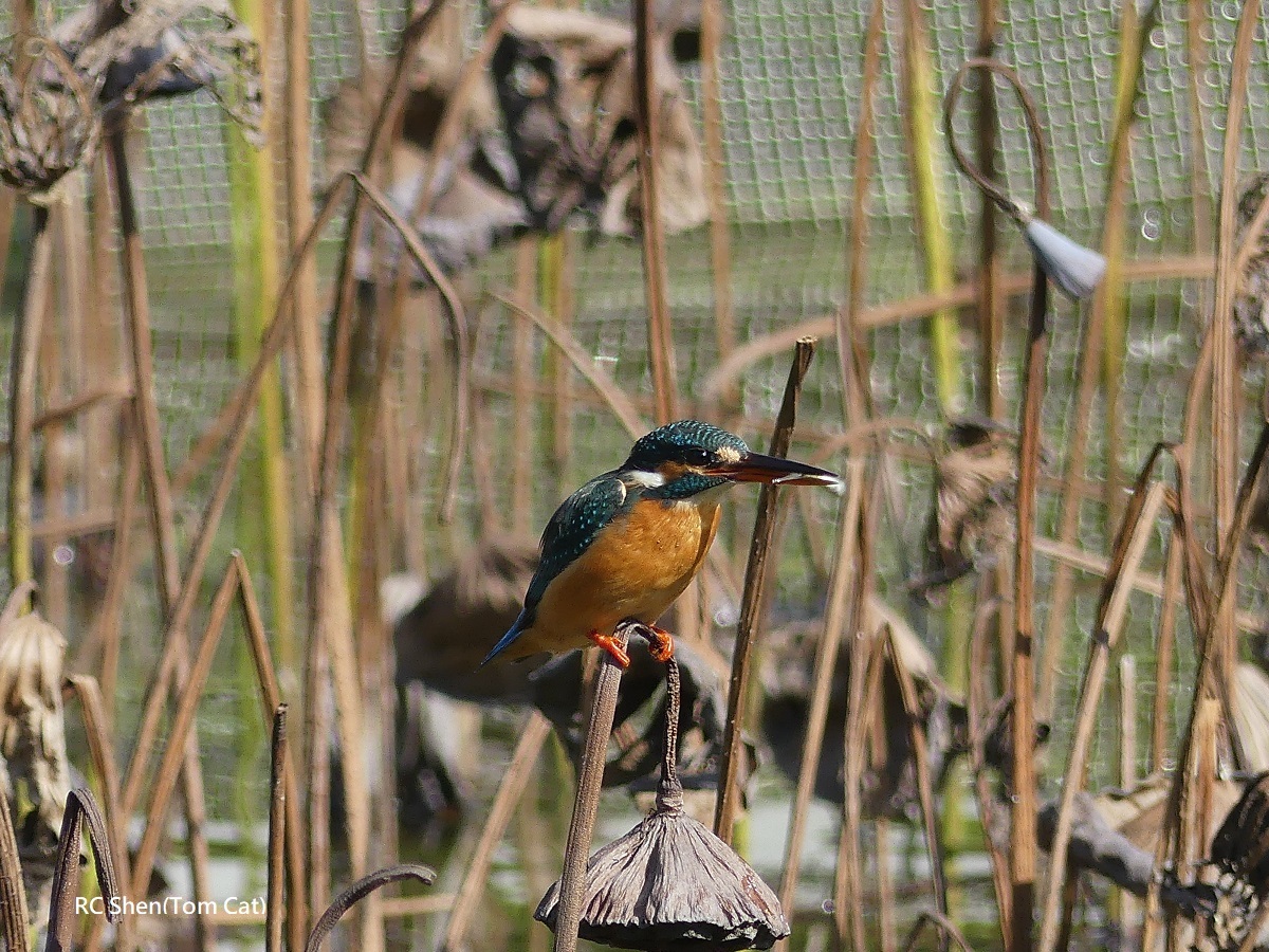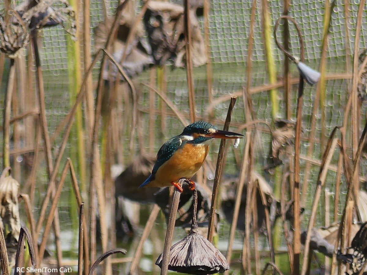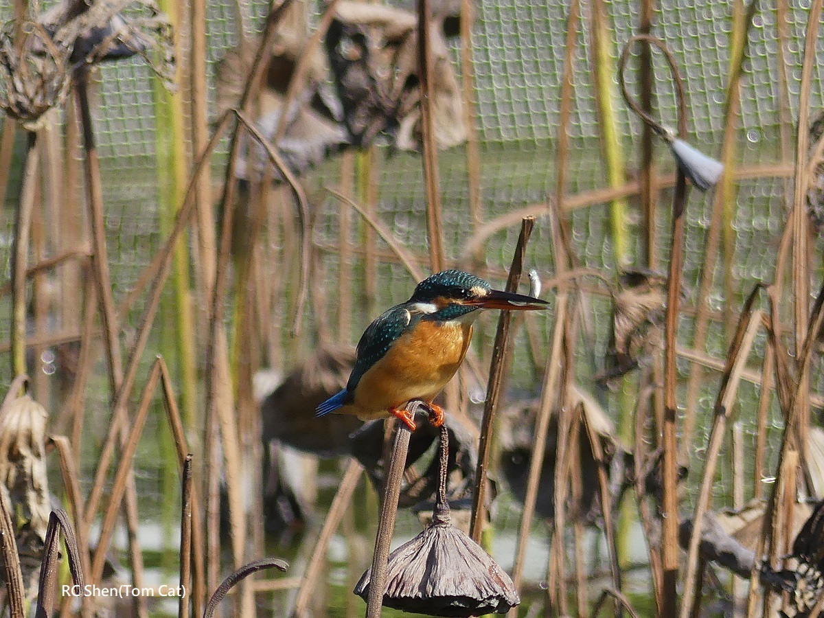 翠鳥捕到魚,站在枯蓮蓬上,魚不斷在翠鳥嘴裡擺動6連拍!