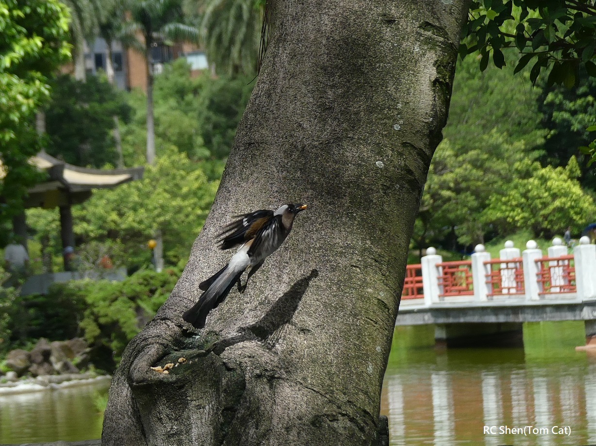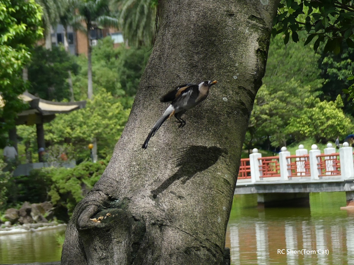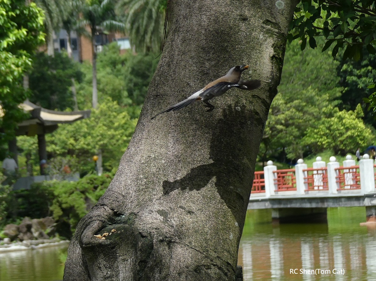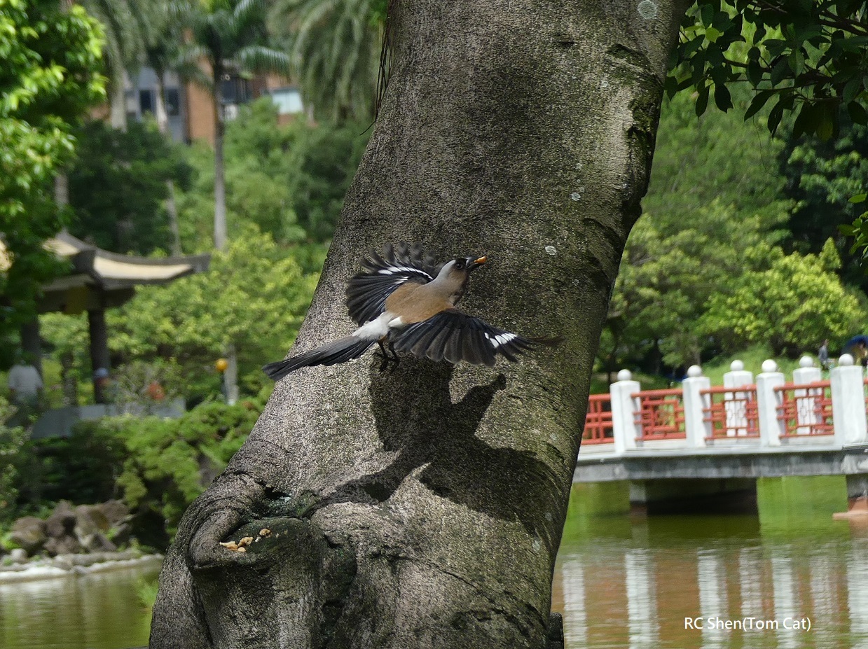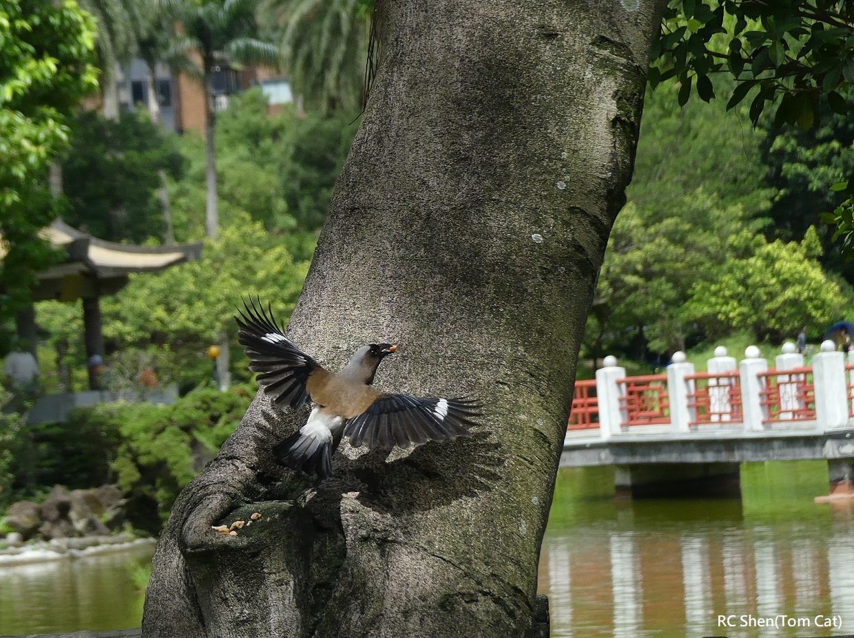 樹鵲展翅起飛,口中含了遊客給松鼠的零嘴