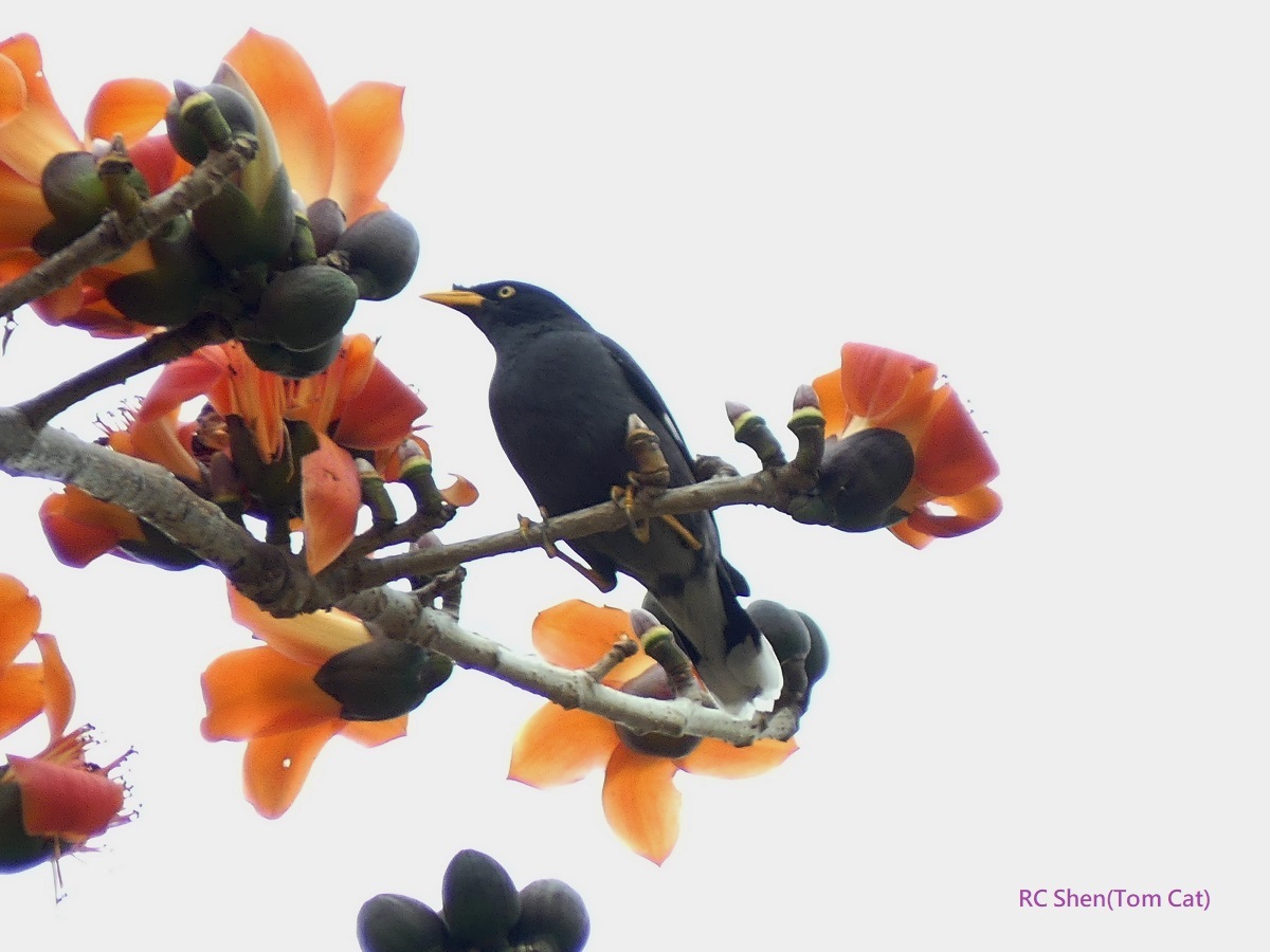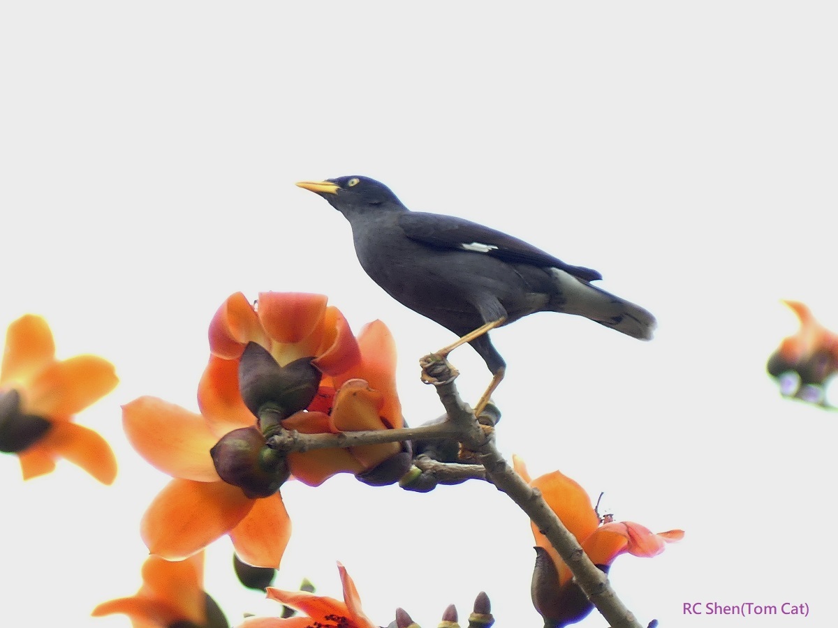 家八哥站枝國父紀念館木棉樹上,橘色木棉花配上黑灰色羽毛,別有風味!