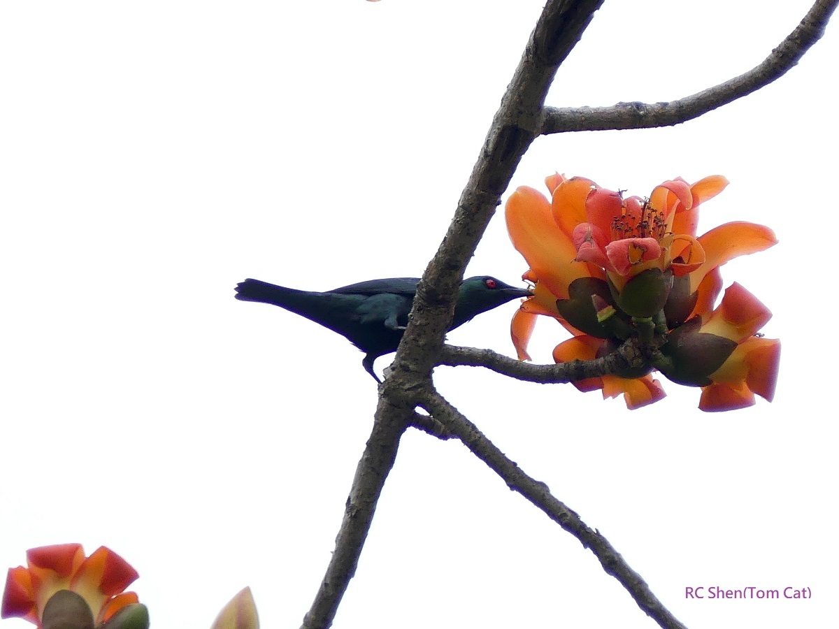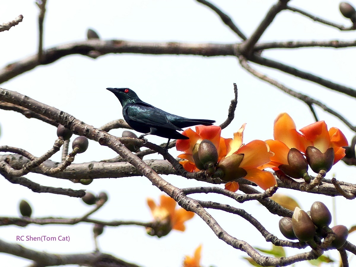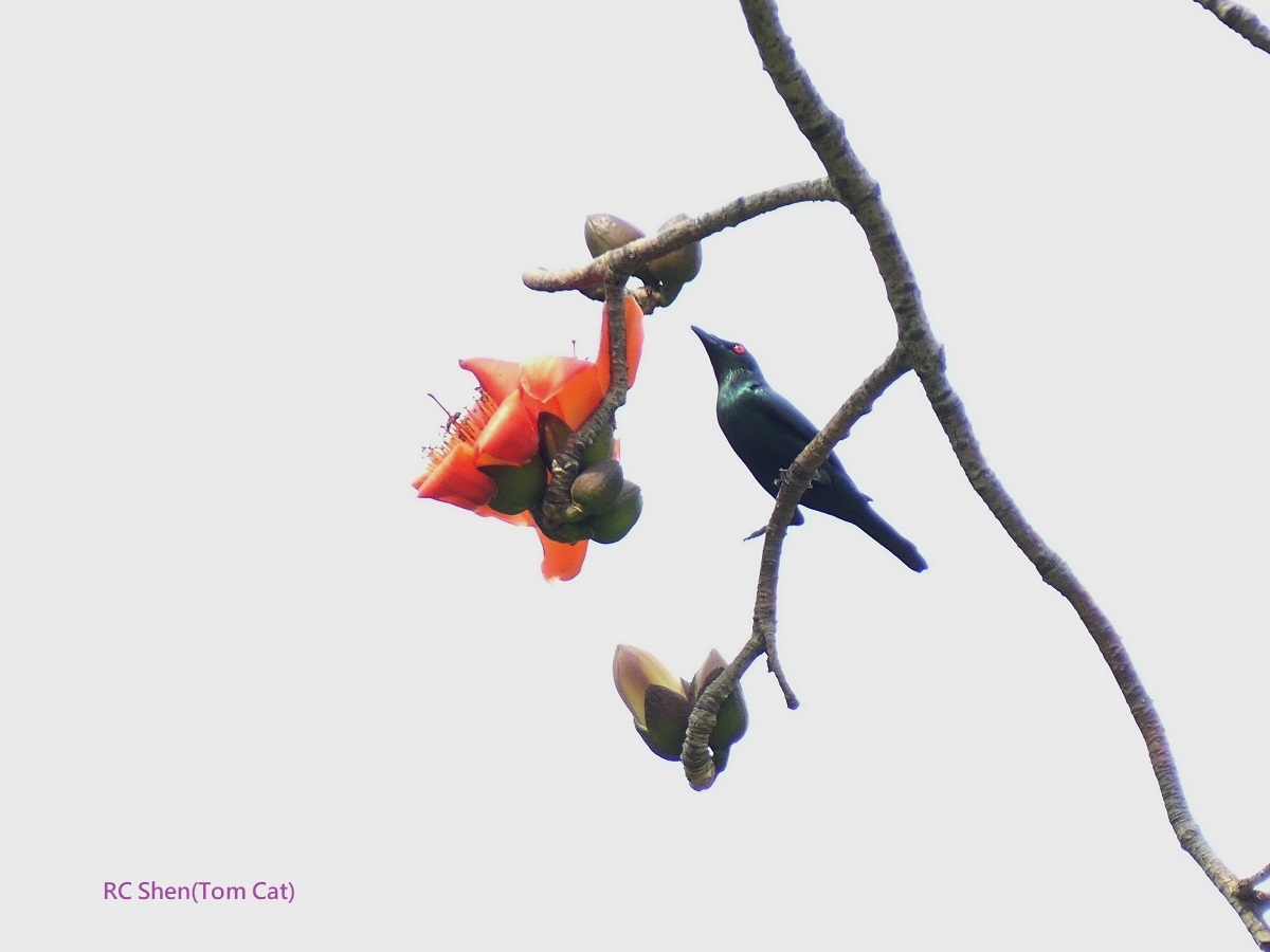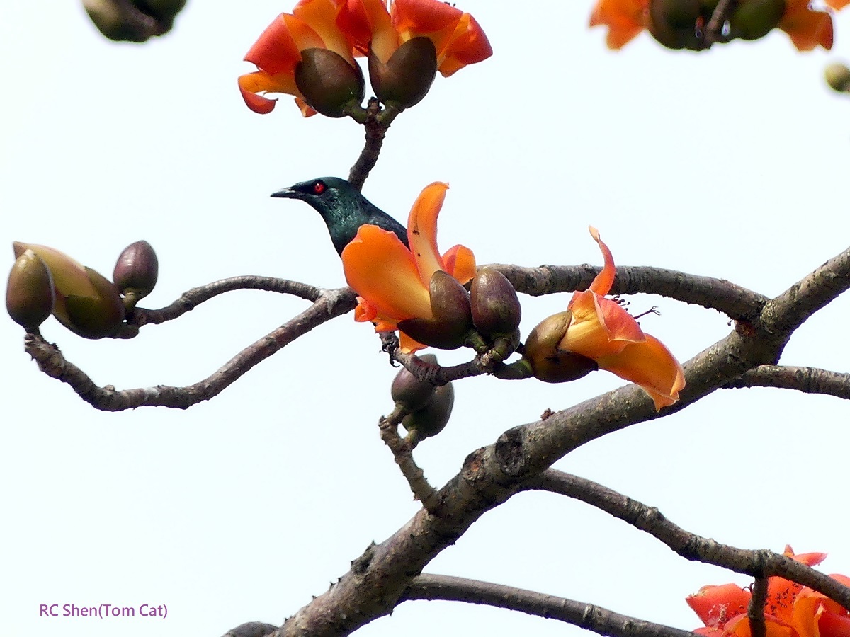 輝椋鳥也飛到木棉花上覓食,紅眼金屬光羽毛,有人稱來自地獄的鳥?