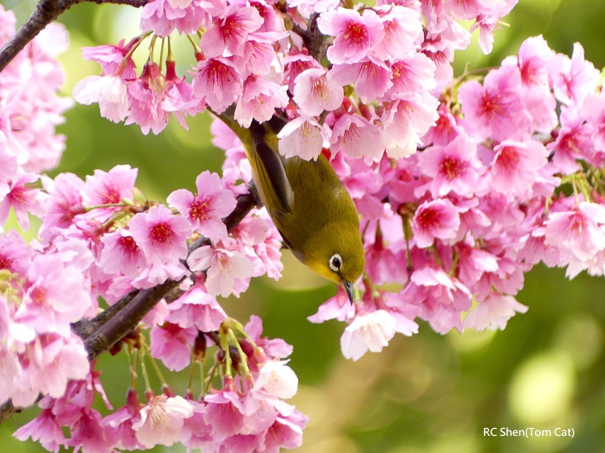 綠繡眼在盛開的寒櫻上吸食花蜜,粉紅叢中一點綠!