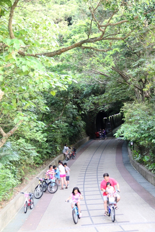 根據租車店老闆說:這舊草嶺隧道內是冬暖夏涼,剛到洞口就吹到一股涼涼的風,太舒服了。隧道內不停播放著「丟丟銅」的歌曲,洞內地上畫著鐵軌,好像就在鐵軌上騎著車。