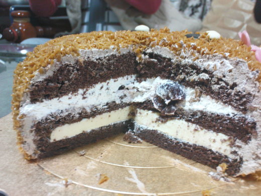 蛋糕最外層有鋪一層類似巧克力屑的東西,吃起來有類似牛奶糖的味道,是還不錯,不過也太甜了