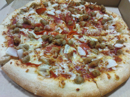 裡頭有美式臘腸、義式肉腸、豬肉、洋蔥。
