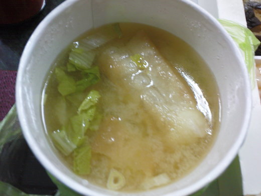 味增湯,裡頭除了豆腐、海帶、油條還有一些魚塊,但是偏鹹。