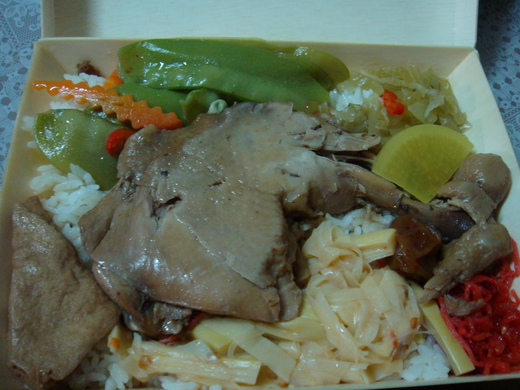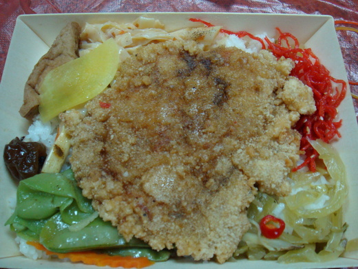 這個呢是炸的排骨,滷的排骨好像要$120,所以我們才選擇炸排骨,排骨蠻大塊的,而且沒有骨頭,是蠻香的啦!!配菜就是一些醬瓜、筍乾、榨菜跟一道現炒青菜,基本上還不錯吃,但是我覺得不怎麼特別,跟一般的便當差不多。