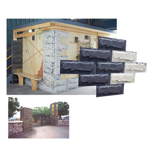 銳賽克板材可製成仿石板磚可取代在台灣潮濕炎熱的氣候下,木、竹、磚石等傳統材料,且可在建造圍牆的施工上提供快速之方法,並可在C型鋼、角鋼、舊磚牆快速組合施工,且可指定顏色搭配、易維修、具多樣性且防污性佳等特性,可適用於各種造型圍牆安裝的應用市場,可說是集美觀、堅固、經濟及快速於一體的新藝術牆面磚。