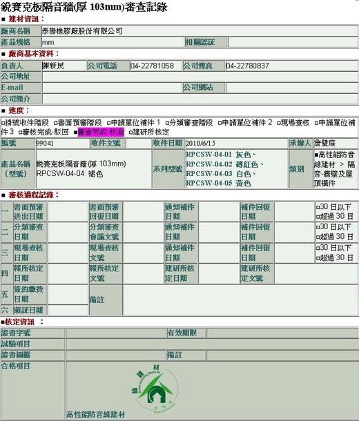 經本公司全體員工的努力,恭賀本公司銳賽克板隔音牆通過綠建材審查核准,特此公告分享喜悅。