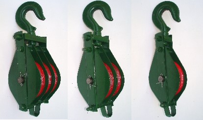 金虎大有限公司生產的滑車、滑輪、滑車吊輪、吊具規格由2"~12",頭形有勾頭及圓頭兩種,轉輪式樣則有一輪至三輪,各式滑輪安全承受力(SLB)為3"--500ka,4"--1000ka,5"--1500ka,6"--2500ka,7"3500ka,8"--4500ka,10"--5000ka。