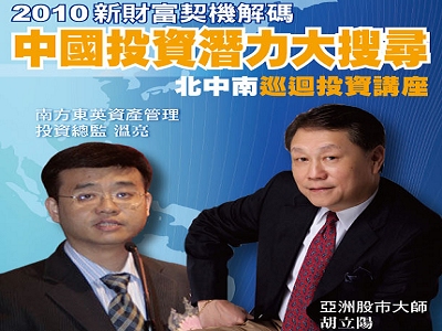 經濟日報與德信投信公司及南方東英資產管理公司共同主辦的「中國投資潛力大搜尋」北、中、南巡迴投資講座,於5月18、19、20日在台北、台中、高雄巡迴舉辦,並邀請股市教父胡立陽,以及南方東英資產管理公司投資總監溫亮,帶領投資大眾發現財富新契機。