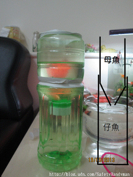 利用飲料瓶依圖面銜接,就成了很好的育嬰室拉!看我旁邊的成果,下方有好多小魚(小黑點),而上方紅色部分是母魚(光線經過瓶子有變形)。都沒花費任何成本,只要美工刀將瓶子切開,將瓶蓋開洞,再將憑資依圖面銜接,貼上電火布以免漏水與割到,再把曝氣管通進去一切大功告成。