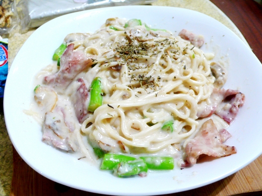 培根兩條(切片)、蘆筍三根(切段)、新鮮磨菇四朵(切片)、義大利麵一把(也可以用傳統的細麵)。