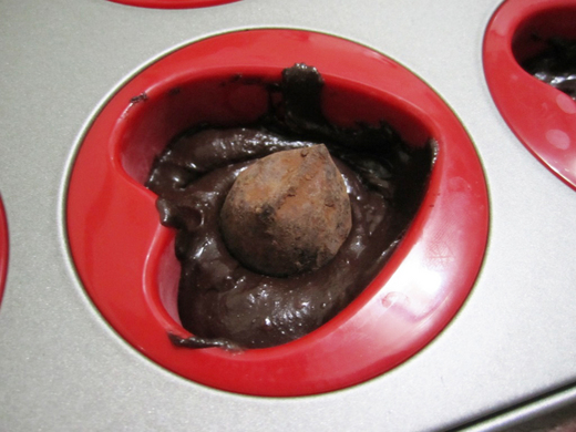 4.等冷卻時間到後,按照順序把材料放入模型中:巧糊(一湯匙)→巧克力→巧糊(蓋住)