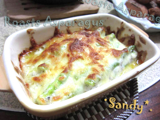 2.蘆筍切段(長度約5公分)再加入B拌勻後,排入烤缽中鋪上乳酪絲。