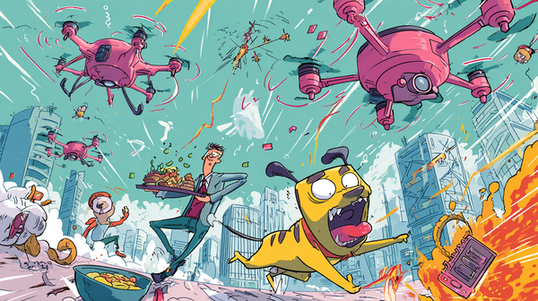 3. 無人機載著阿志飛上高樓,阿志站在機身上意氣風發。12樓窗邊的同事驚訝地看著窗外的天空,指著阿志。同事說:「欸欸,那不是阿志嗎!?」阿志回:「爽啦~誰還跟你擠電梯!」