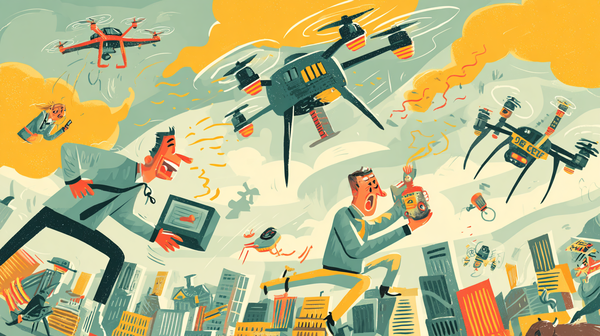 1.下班時分正下著傾盆大雨。阿志在電腦前猛然抬頭看窗外,臉色一驚。他一手操作無人機App,一手緊張地定位女友阿美的位置。阿志說:「糟了,她忘了帶傘,快派無人機去幫她撐傘!」
