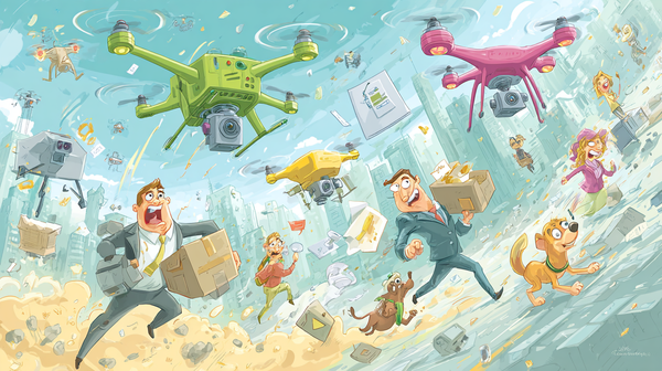1.辦公大樓外,阿聰正走在人行道上,頭頂盤旋一台無人機。旁邊有路人竊笑看著。阿聰一臉無奈仰頭,無人機鏡頭閃光,明顯是被拍攝中。丈母娘懷疑阿聰有外遇,派出無人機全天候追蹤。阿聰內心道:「這也太誇張了吧,連上廁所都會跟著!」