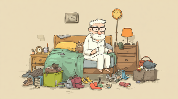 2.王老先生低頭趕緊穿上一隻襪子之後,卻怎麼也找不到另一隻襪子,焦急而又沮喪的翻箱倒櫃,弄得天翻地覆。