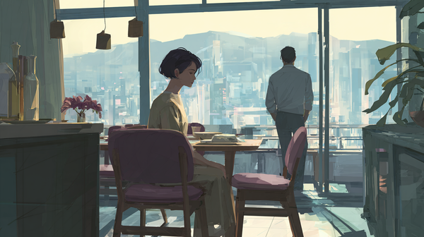 他轉身,看見婉真坐在餐桌前,正在低頭滑著手機,靜靜的等他。
