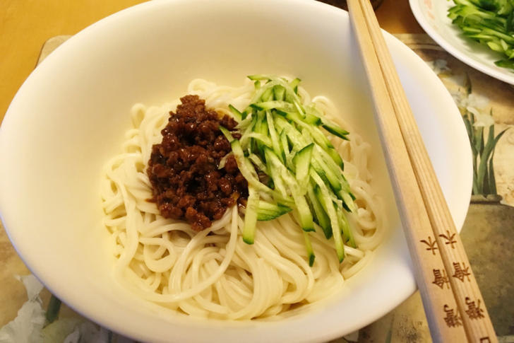 "來,妳來看麵可以了嗎?",他則將小黃瓜絲和炸醬放上餐桌。