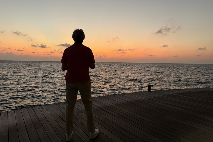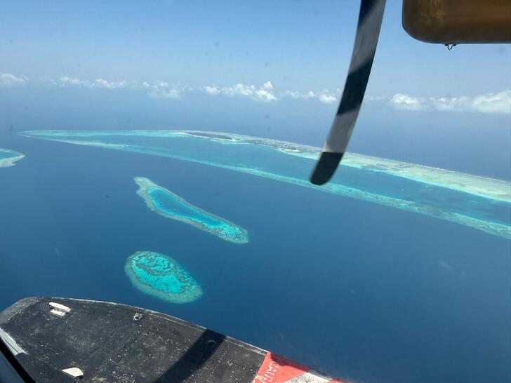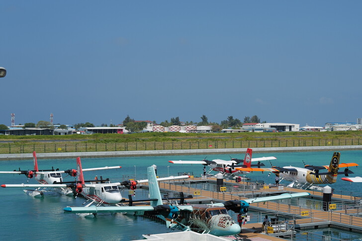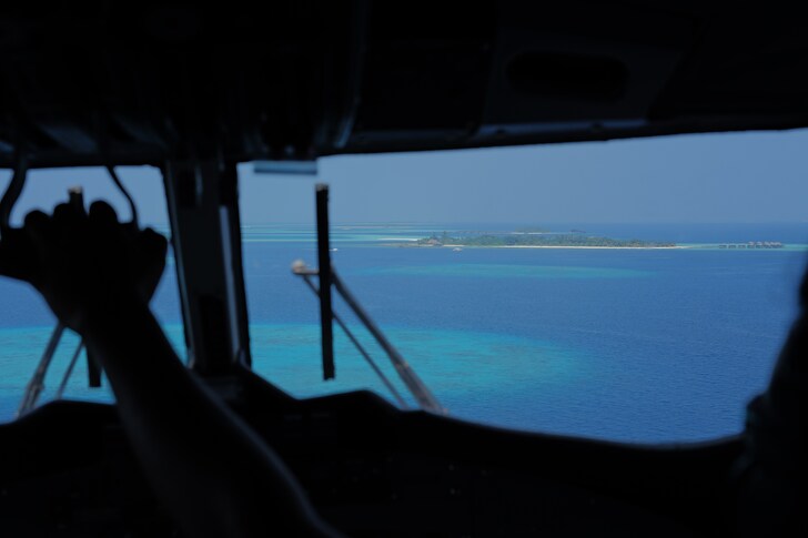 在馬累住一晚,隔天一早,前往水上飛機場,飛往目的地。旅遊經驗雖豐富,但卻第一次有機會搭水上飛機,心中忐忑但卻又興奮期盼體驗,搭上在水上十分晃動的飛機,無法轉身的狹小空間只容納十四個座位,坐在第一排,伸個手就能碰到機長,儀表板和操作桿清晰可見,起飛十分平穩,螺旋槳的噪音震耳,快速爬升高度,飛行時,整架飛機有一種機械式的震動,像是坐在避震器不好的車子上,不舒服的感覺很快就被俯瞰時的眼下人間仙境所轉移,深藍淺藍層次分明的海水,配上海洋中大大小小形狀各異的迷人島礁,讓人有飛翔在夢幻世界之中的舒暢,降落時,承受與水面衝撞瞬間的刺激感,心中有莫名的感動,原是行程中擔心的環節,卻成為生活中一個美好的經驗。