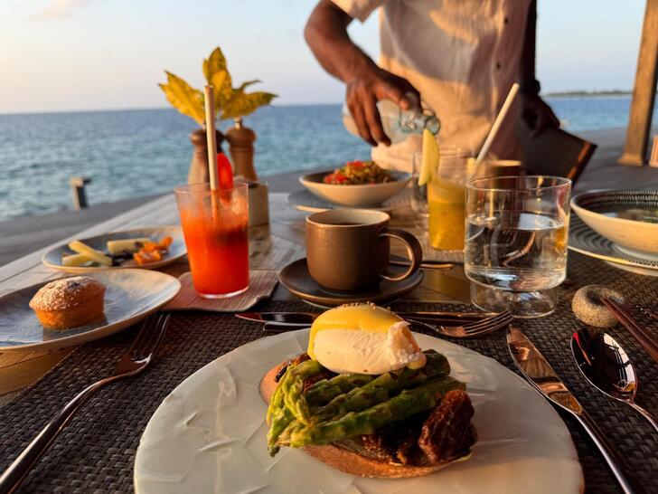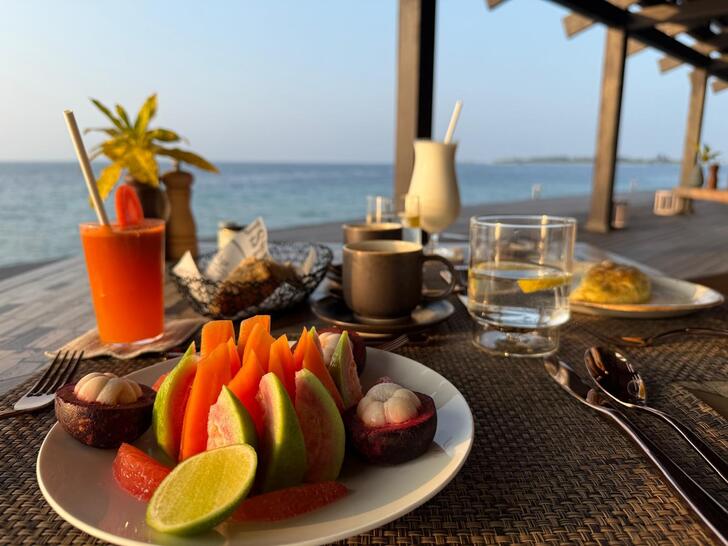 羅曼蒂克的清晨,在餐廳的露天區享用有晨曦和海洋陪伴的早餐,早餐雖有固定的菜單,但是,任何能想到的食材組合和烹飪方式,廚師都樂意接受,就像擁有私人廚師一般。