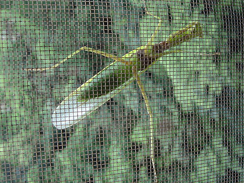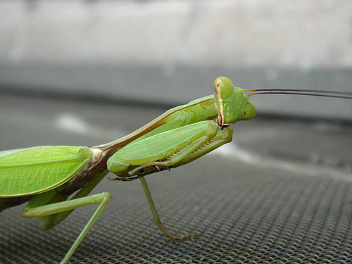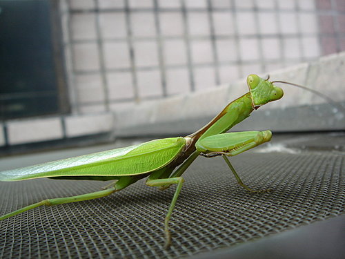 不過,今天的紗窗卻好似有些東西,拉開一看,是隻通身透綠的螳螂兄。