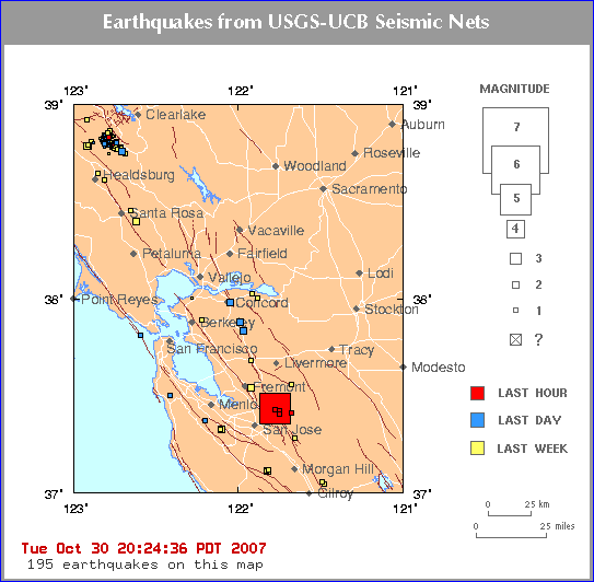 Wednesday, October 31, 2007 at 3:04:54 (UTC) Distance from Alum Rock, CA - 8 km (5 miles) NNE (31 degrees)