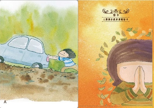 而我練習中抽到的故事卡,畫面是一張男孩推著汽車上坡的卡片,