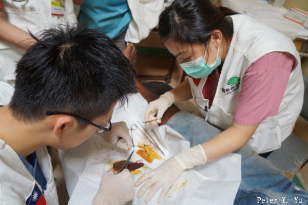 此行在坎達武島上除了看診,因身兼外科系的職掌,也進行了七例門診手術。許多平時在台灣可能需要開刀房設施或轉診其他外科專科的腫瘤,秉持著「今日若不幫這些病人處理,他們可能此生都不會有機會接受手術」的信念,在艱困有限的環境下勉力進行手術。有全家搭船兩小時抱著一線希望只為處理眼下腫瘤的小妹妹,有大如雞卵長了十五年的皮膚腫瘤。我們在極為陽春的環境下,停電僅靠手中微弱的手電筒照明、彎腰駝背揮汗如雨、還得與揮之不去的蒼蠅奮戰之中進行了多例手術,幸賴開刀房黃鈺甯護理師的協助才能順利完成。術後聽到病人滿心歡喜地說: 「十五年來,這是我最快樂的一天!」,醫師心中成就感與滿滿的溫暖,讓人憶起當初立志進入醫業的心情,絕非金錢可以比擬。此外,也遇到大型撕裂創傷深可見骨的案例,多虧深具野戰醫學經驗的陳致福醫師挺身而出指揮全局,多人共同戮力清創、止血、縫合,再由感染科專業的黃政華副院長開立抗生素收治住院,將原本在這個島上可能因感染截肢或不復行走的男病人,保住下肢行動的能力。短短三天半的時間,我們密集看了448 例病人,相信必對Kadavu離島的醫療,做出了相當可觀的貢獻。