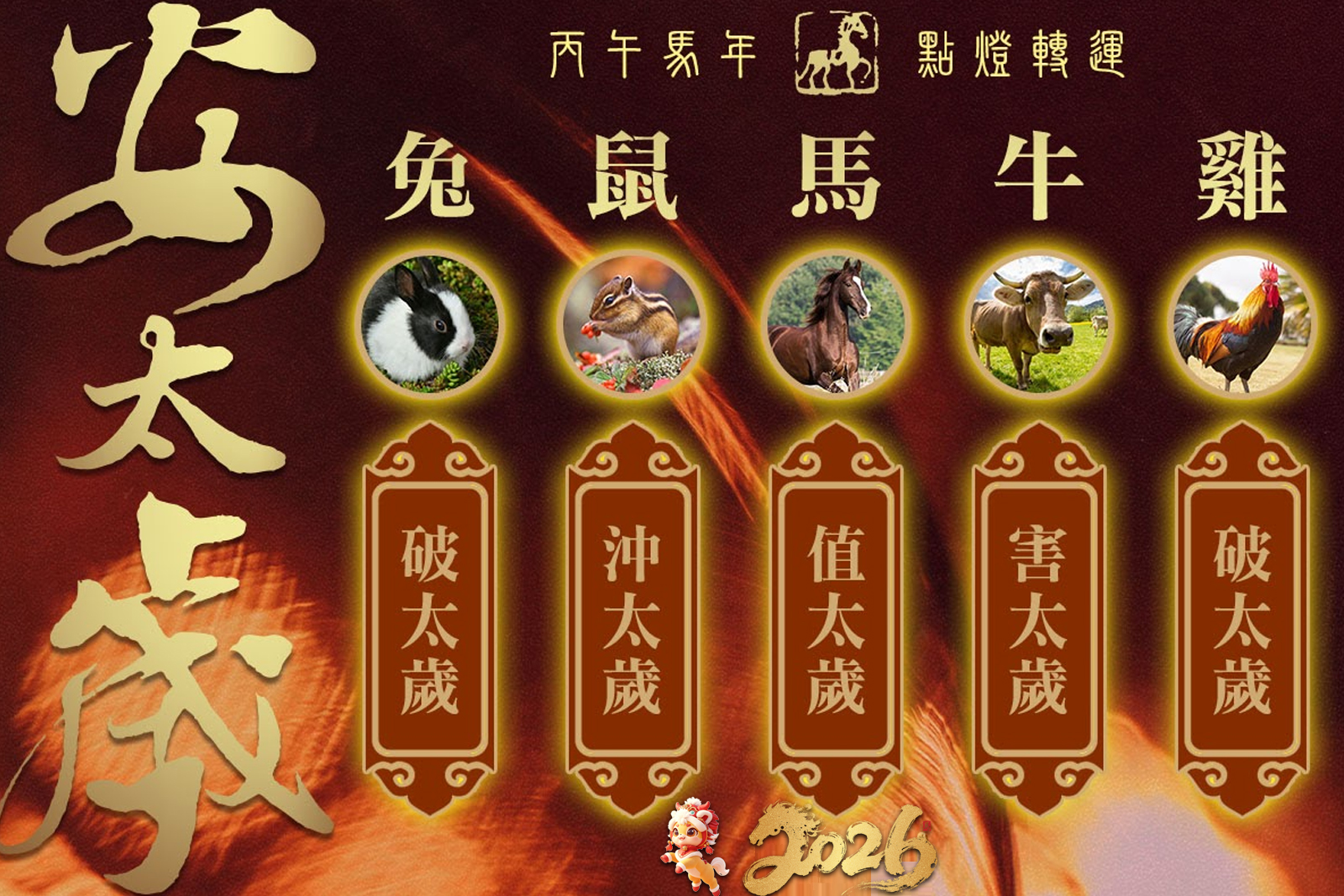 2026年(丙午馬年)犯太歲的生肖有 馬(值太歲/刑太歲)、鼠(沖太歲)、牛(害太歲)、兔(破太歲)和 雞(偏沖/破太歲),其中屬鼠(子午沖)是正沖,變動大,牛、兔、雞則屬偏沖,影響各異,需謹慎處理事業、財運和人際關係。