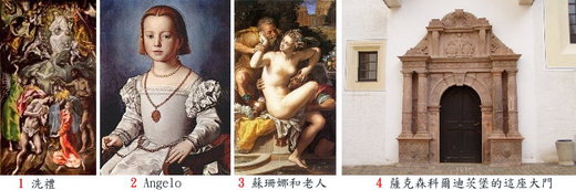 3 《蘇珊娜和老人》, Alessandro Allori(1535 - 1607)所繪。以蒼白而帶有色情意味的人物加上燦爛的靜物細節,畫面顯得擁擠而扭曲。