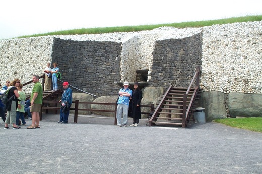 等了十幾分鐘之後,總算輪到我們這一組人入內參觀了。幾十公尺狹窄的岩石通道,一次只容一人通過,胖一點的人還得側身擠過去呢!因為不是冬至,三個古墓房間內其實是黑漆漆的,但為了讓觀光客體驗冬至時一線陽光穿過曲折岩石,投射到墓穴屍體上的畫面,他們以燈光模擬出同樣的情景。大門口螺旋形的圖騰充滿神祕的氣息,土丘內外的設計所傳達的古老訊息,今人已經無據可考,這些就留待考古學家們慢慢去研究吧!