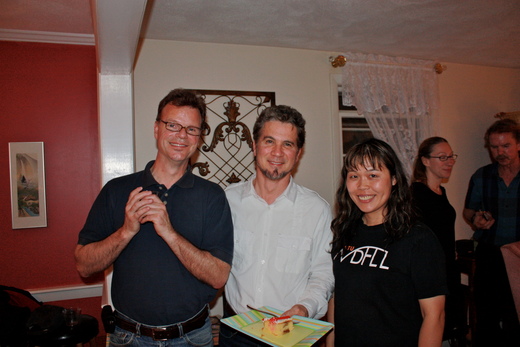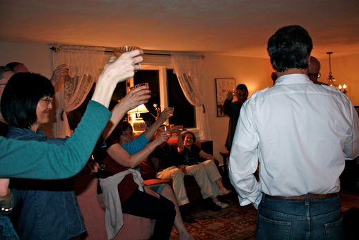 我很少把跟別人的合照放上網站上,因為怕觸犯隱私權,不過我偷偷放兩張在某人家派對上拍的照片,因為他們都在美國,也看不懂中文,我也連絡不到他們了,所以應該可以讓你們看看。我記得在那個派對中,站在我旁邊跟我合照的人是芭蕾舞團中的音樂指揮,他跟我聊到進入休息室時,被那群舞者的汗臭味薰得受不了。我在想,芭蕾舞者在舞台上多麼迷人啊!我哪裡會想到人家劇烈運動後的汗臭味和磨黑的腳趾頭呢?無論再美麗的人,在鎂光燈下多麼光鮮亮麗,總是免不了會有汗臭味,和苦練之後被犧牲的可憐的腳趾頭。