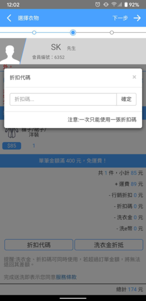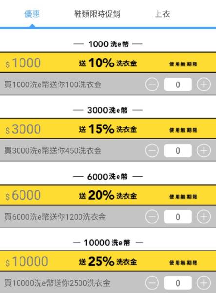 洗e幣類似像商品卡,購買洗e幣後,每次的消費都能以洗e幣結帳,還能獲得10%~25%的bonus「洗衣金」,最適合有固定送洗需求的用戶。再教你一個大絕招:如果你單筆要送洗近千或千元以上,那先購買1000元洗e幣再下單,就能現折100元洗衣金,相當於直接打9折哦(其他面額以此類推)。但要注意的是:洗e幣就好比悠遊卡,當餘額不足時是無法進行消費的,所以當消費金額大於現有洗e幣時,記得要先購買洗e幣才能正常使用哦~