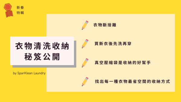 平常整理與清洗衣物、寢具是習慣,過年全面將床組、衣物整頓一番則是讓新的一年有個好的開始。 以下提供幾個過年整理清潔家中衣物及寢具幾個小撇步,想讓新的一年有個好開始的你,趕快接著看下去吧! 1.衣物斷捨...