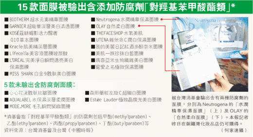 台灣消基會的化驗結果顯示,雖然15個面膜樣本含“對羥基苯甲酸酯類”防腐劑,但全部含量都在台灣衛署規定限量1%以下的標準內,但台灣消基會秘書長吳家誠點名批評兩款在中國生產的面膜品牌,分別是Neutrogena“水潤精華保濕面膜”,內含“對羥基苯甲酸甲酯”和“對羥基苯甲酸乙酯”兩種防腐劑;以及OLAY“自然柔白面膜”,內含“對羥基苯甲酸乙酯”和“對羥基苯甲酸丙酯”兩種防腐劑。