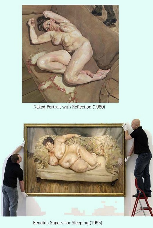 他常找英國當代社會名流來當模特兒作畫,而且畫的是全身的裸像。我見到一篇介紹,有記者訪問一位當 Lucian 模特兒的女名人,將她所有的 sitting 時間加起來,幾乎要到一年。