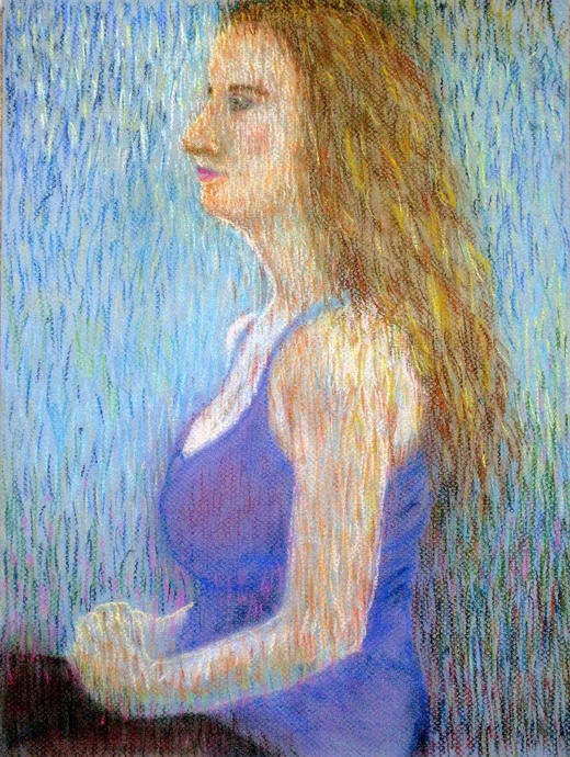 這是本學期最後一張,起初完全畫壞了,因為我選用灰藍色為底的粉彩畫紙,於上色時,想做新的嘗試,所以預備以藍色系的粉彩為主,結果老師一看,便說「鬼魂出現了!」果然整張畫好像畫的不是模特兒,而是一個「幽靈」!加上課堂內時間不夠,匆匆結束。