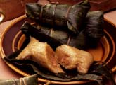 4.取二片粽葉,交錯置於手中,折成漏斗狀,放入糯米至1/2滿後,放入肉餡,再填入糯米,將粽葉折包起,用粽繩繫緊,放入一有隔板的蒸鍋中,注入熱水,加蓋,以100電力蒸18分鐘即可。