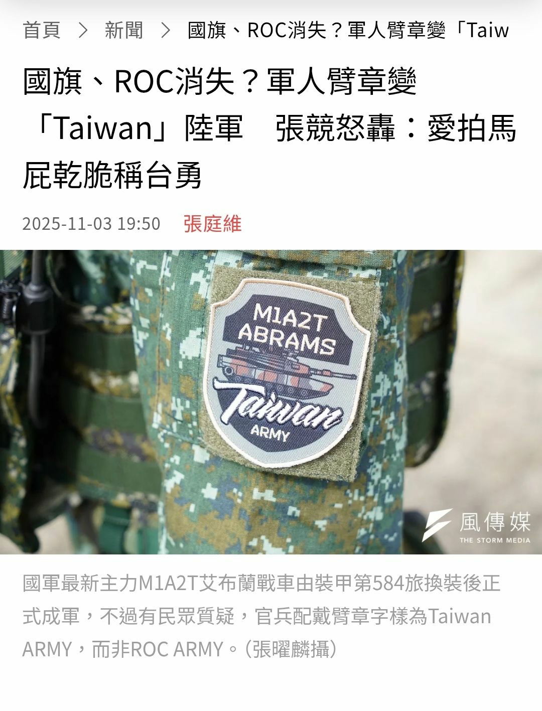 | 國軍最新主力M1A2T艾布蘭戰車由裝甲第584旅換裝後正式成軍,官兵配戴臂章字樣為Taiwan ARMY,而非ROC ARMY,「國旗」及「中華民國」字樣都未出現。 對此,中華戰略學會資深研究員張競在臉書發文痛批軍方,若真要本土化,乾脆直接稱「台勇」或「台灣團練」,放著正版不用,故意用這種山寨版,「馬屁震天響」,天天把「國軍」貶抑成「台軍」掛在嘴邊,其實就是源自對岸中國共產黨,顯然「中共同路人」或是「在地協力者」出這個餿主意(註1)。 張競看到Taiwan ARMY臂章就抓狂,並對國軍本土化視為罪大惡極,蔑稱Taiwan ARMY是「山寨」、「馬屁」,要國軍改稱為「台勇」或「台灣團練」是典型搞不清楚狀況的膝蓋式條件式反射! 因為,不光是中國把台灣國軍稱為「台軍」,美國也是如此(註2),國軍是由台灣人組成用台灣納稅人的血汗錢建立的軍隊,不稱「台軍」,難道稱「中國軍」,然後像夏瀛洲這些還以「黃埔」自稱的中國國民黨退役將領那樣敵我不分,跟「共軍」一家親? 事實上,儘管包括馬英九在內的中國國民黨政客總說:「一個中國,就是中華民國!」(註3),但事實上,他們心裡比誰都還清楚,「中華民國」早就被他們玩完了,所以2009年身為三軍統帥的馬英九出訪時遇到了當時的美國國務卿希拉蕊說:「I am the president of Taiwan」(註4),怎麼不見張競跳出來罵? 誠如美國川普日前所言:「台灣就是台灣!」(註5),不是中國的一部分,奉勸張競面對現實,拋棄著虛假的大中國意識形態,國軍就是二千三百萬台灣人國家的軍隊,早就不是那個在國共內戰中兵敗如山倒,倉皇竄逃到台灣後還自不量力要「消滅萬惡共匪」懼戰怕戰卻要把台灣推入火坑的中國國民黨黨軍! (註1) https://www.storm.mg/article/11078499 (註2) https://breakingdefense.com/2025/10/official-signals-changes-to-taiwan-military-aid-potential-aukus-alterations/ (註3) https://www.youtube.com/watch?v=aV86Dmz4YUs (註4) https://news.cts.com.tw/cts/politics/200906/200906020267468.html ![]() |