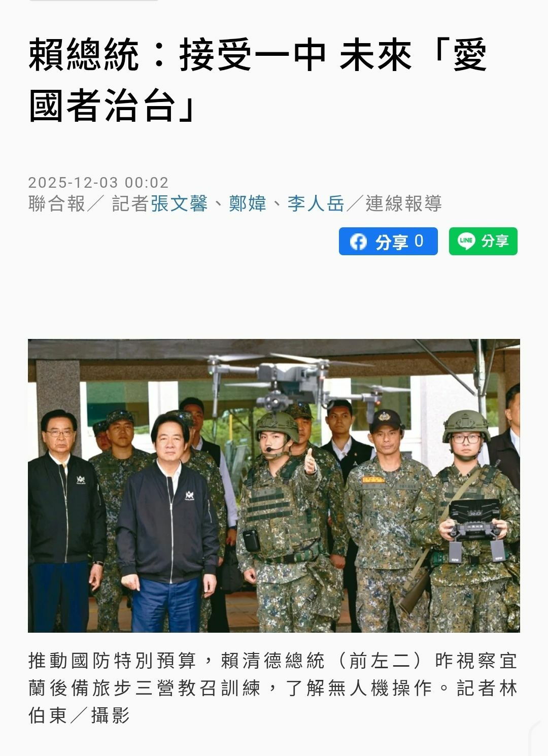 比方說,《聯合報》最近一篇報導的標題是「賴總統:接受一中 未來『愛國者治台』」,乍看之下,會讓人以為賴清德總統怎麼忽然從「務實的台獨工作者」變成了向中國共產黨投降的統派了?