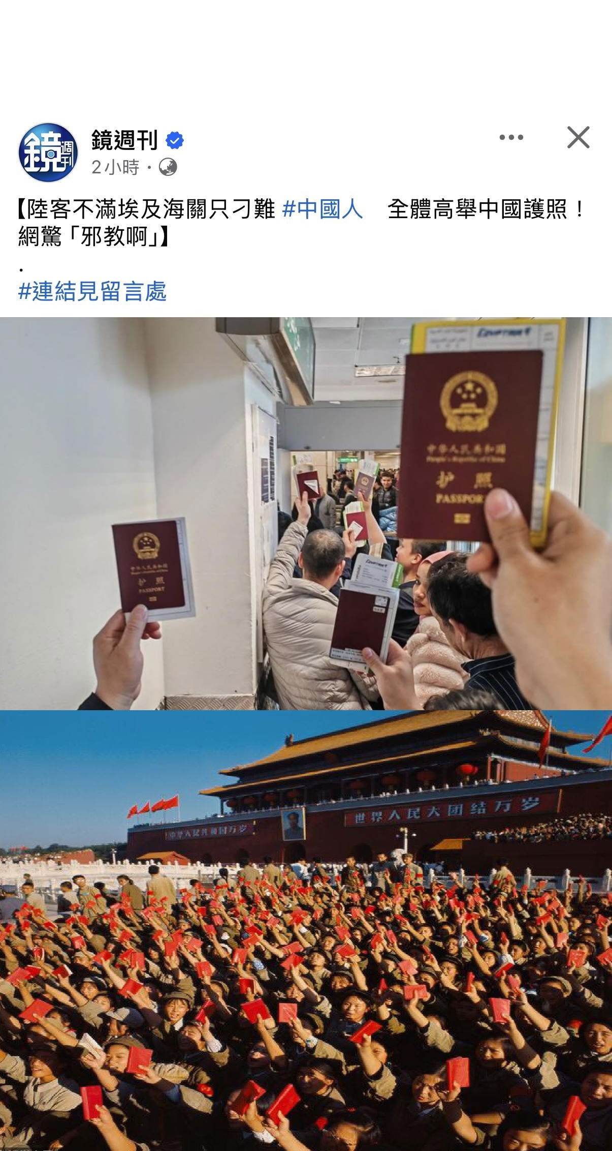 但這高舉中國護照的畫面,其實更像是文化大革命時代紅衛兵們齊聚天安門廣場高舉被暱稱為「小紅書」的毛語錄對毛澤東高呼萬歲的歷史重演,更讓世人見識到:在中國共產黨的強勢灌輸洗腦下,「中國」對所有的中國人們來說其實並不是個國家,而是個不容質疑的宗教,而且是個不可理喻的邪教!