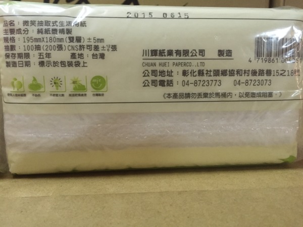 微笑100抽抽取式生活用紙,尺寸195mm*180mm(2層)、純紙漿精製、不可溶於水,1箱48包(8包6串),歡迎團體訂購、大量訂購本公司有外送服務,詢價訂貨專線:03-5680009。