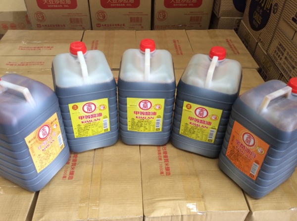 由左至右:金蘭甘醇油膏(5L)、金蘭淡色醬油(5L)、金蘭甲等醬油(5L)、金蘭濃色醬油(5L)、金蘭油膏(5L),歡迎團體訂購,大量訂購本公司提供送貨服務,詢價訂貨電話:03-5680009。